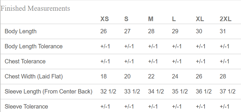 See Finished Measurements for sizing guide